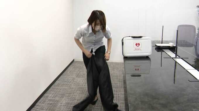 RKB吉松真希「こちらのバッグには、長ズボンも入っています。このように服の上からも履けて、スカートやショートパンツを履く女性も安心して横になることができそうです。」