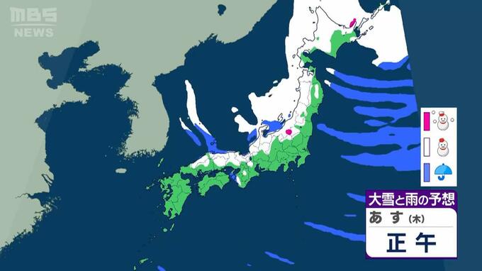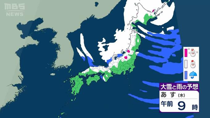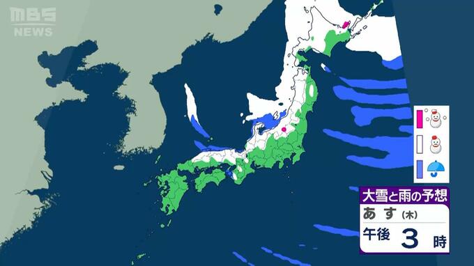 【大雪情報】「この冬1番の寒気」上空にマイナス40℃の強い寒気 警報級大雪の可能性 25日にかけ近畿、北陸など日本海側で大雪見込み 毎日放送 2024年1月24日(水) 20:45 国内 天気 【25日(木)3時間ごとの雪と雨シミュレーション】