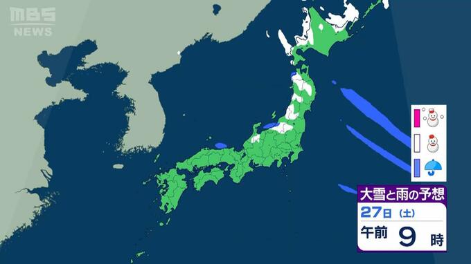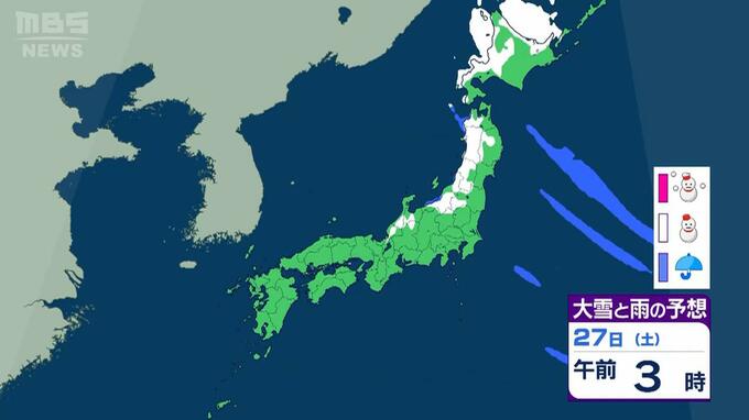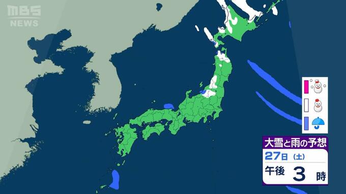 【大雪情報】「この冬1番の寒気」上空にマイナス40℃の強い寒気 警報級大雪の可能性 25日にかけ近畿、北陸など日本海側で大雪見込み 毎日放送 2024年1月24日(水) 20:45 国内 天気 【27日(土)3時間ごとの雪と雨シミュレーション】