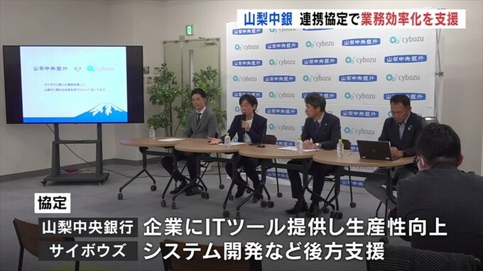 この協定で山梨中銀は顧客の企業にIT技術を活用したツールを提供して企業の生産性の向上を支え、サイボウズがシステムの開発など後方支援を行います。