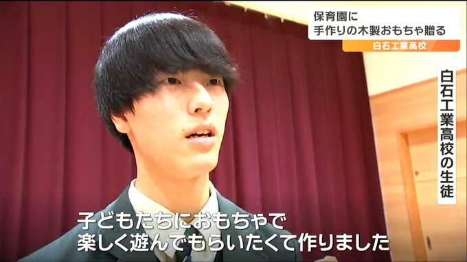 白石工業高校では、7年ほど前から地元の保育園や幼稚園に木製のおもちゃを贈っています。これからも木の温もりが伝わる手作りのおもちゃをプレゼントしたいと話していました。