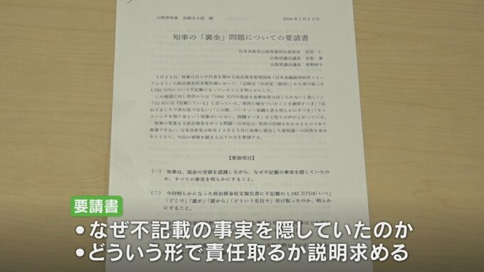 共産党山梨県委員会は山梨県の長崎知事に対し、責任の取り方を明らかにすることなどを求める要請書を提出しました。
