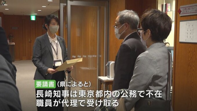 22日、共産党山梨県委員会の花田仁委員長らが県庁を訪れて要請書を提出し、東京都内の公務で不在という長崎知事に代わり、県の職員が代理で受け取りました。