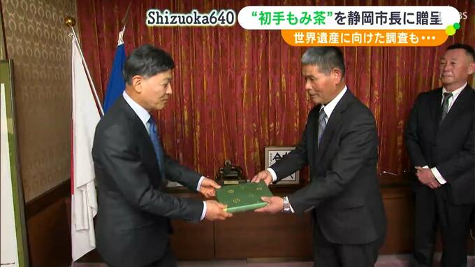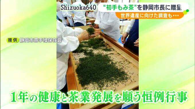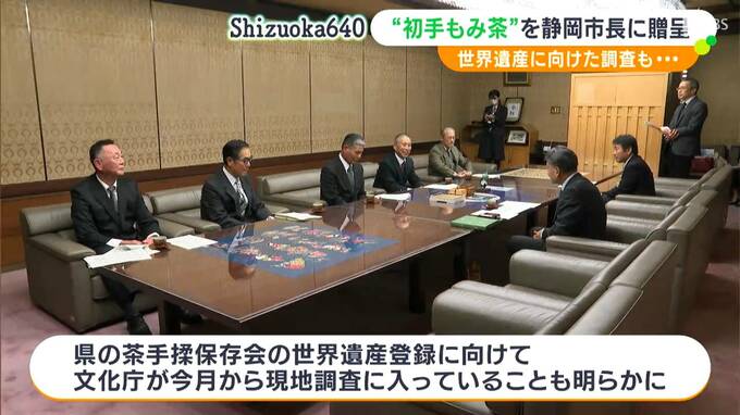 静岡市の難波市長のもとを訪れたのは静岡市茶手揉保存会の牧野力雄会長など5人です。1月7日に行われた新年初揉みで仕上げた「初揉茶」を難波市長に贈呈しました。手揉みは製茶技術の原点で、初揉みは、1年の健康と茶業の発展を祈願する恒例行事です。