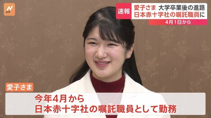 宮内庁は天皇皇后両陛下の長女・愛子さまが今年4月から日本赤十字社の嘱託職員として勤務されることが内定したと発表しました。宮内庁は先ほど、愛子さまの大学卒業後の進路について、今年4月から日本赤十字社の嘱…