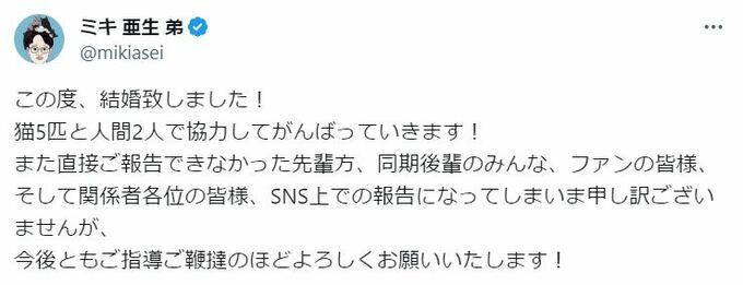 23日、人気お笑いコンビ・ミキの亜生さんが自身のX(旧ツイッター)を更新し、結婚したことを報告しました。