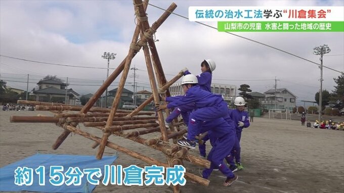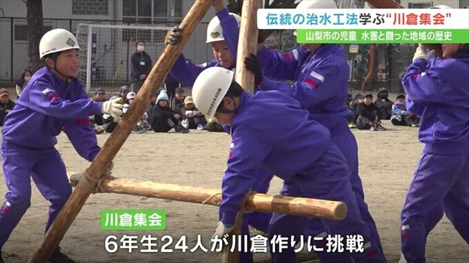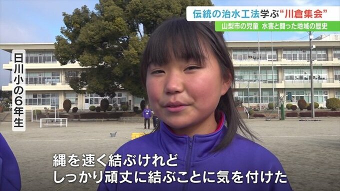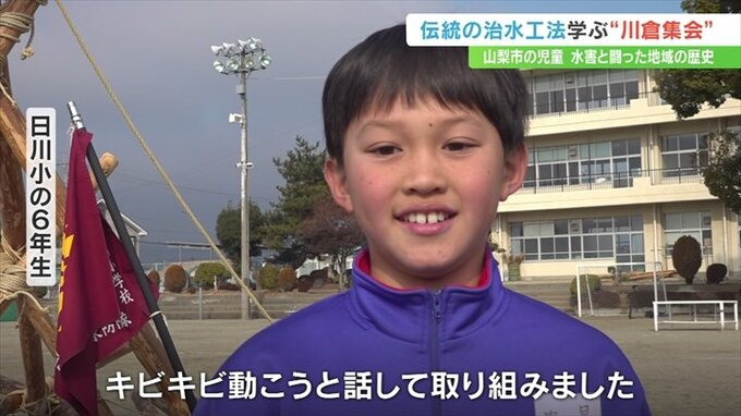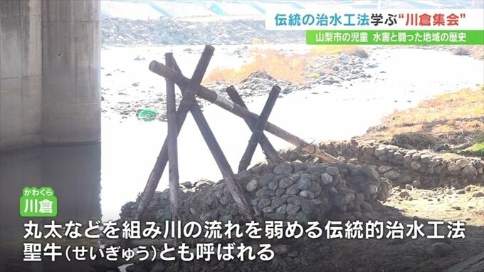 水害と戦ってきた地域の歴史を伝えようと、山梨県山梨市の日川小学校で伝統の治水工法を再現する「川倉集会」が行われました。