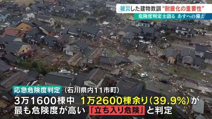 建物の危険度の調査は石川県内11の自治体で行なわれ、対象となった3万1600棟のうち、39.9%を占める1万2600棟あまりが最も危険度が高い「立ち入り危険」と判定されました。