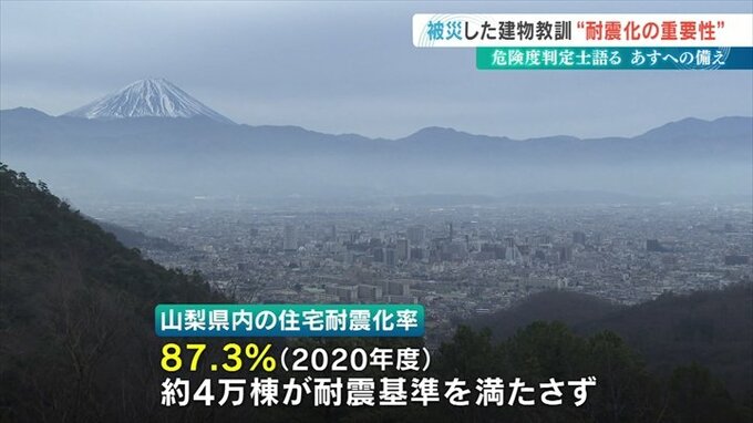 山梨県内の住宅の耐震化率は2020年度で87.3%とほぼ全国平均値ですが、約4万棟が耐震基準を満たしていないとされています。