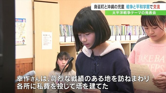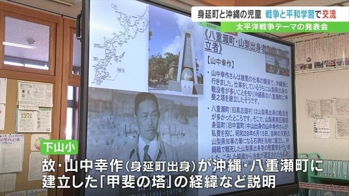この中で下山小は身延町出身の故・山中幸作さんが戦後、沖縄戦の死者を悼んで八重瀬町に建てた慰霊碑「甲斐の塔」建立のいきさつなどを説明しました。