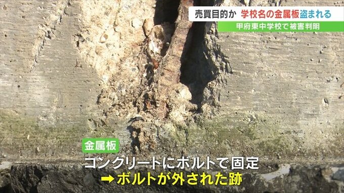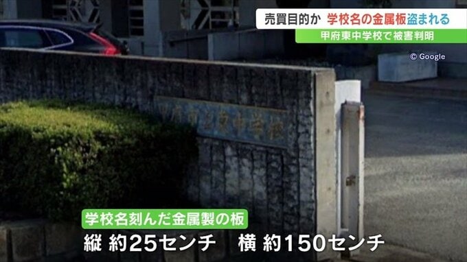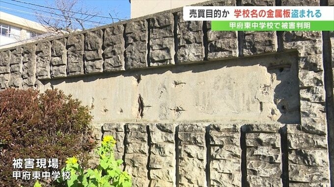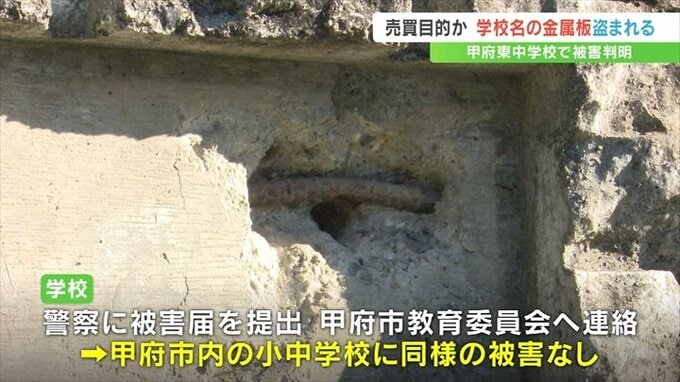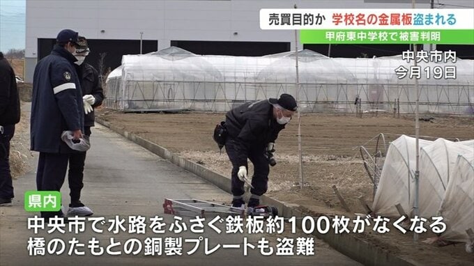 山梨県内で水路をふさぐ鉄板などの盗難が相次ぐ中、甲府市の中学校で学校名を刻んだ金属の板が無くなっていたことがわかりました。
