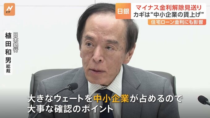 住宅ローン金利などに影響を及ぼすマイナス金利の解除をきょう見送った日本銀行。カギを握るのは大企業だけでなく、中小企業の賃上げです。日銀は金融政策を決める会合で、大規模な金融緩和の維持を決めました。物…