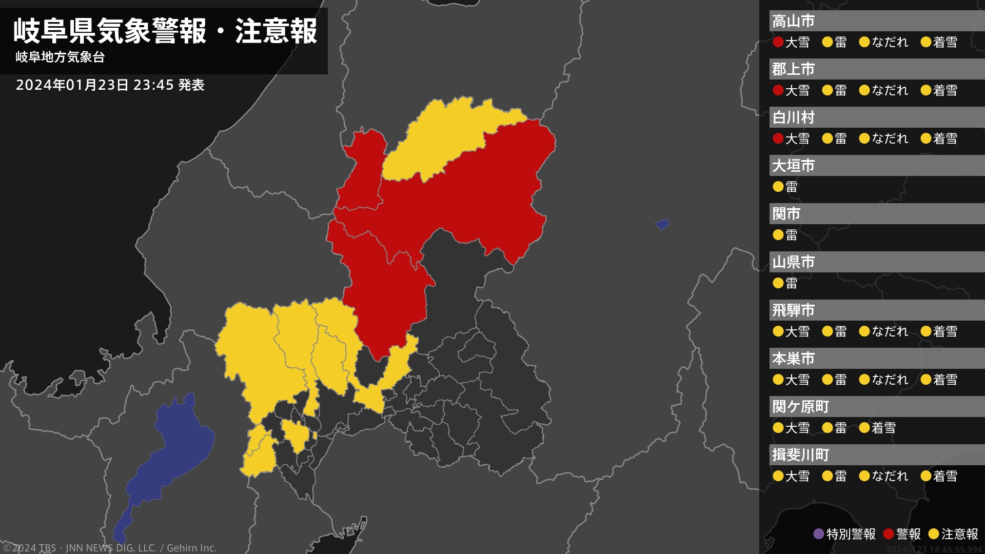 気象台は、午後11時45分に、大雪警報を高山市、郡上市、白川村に発表しました。