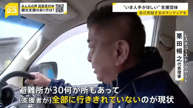 穴水町で活動するNPO法人「レスキューストックヤード」は、避難所を回りながら運営状況を確認し、必要に応じた人員や物資の手配を行ってきました。被災者のために奔走しつづけた栗田さん。「人手不足」の現状をこう話します。
