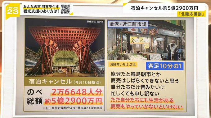 ちなみに、1月10日時点(※石川県旅行業協会より・県内の23宿泊施設)で石川県内の宿泊キャンセルはのべ2万6648人分、総額・約5億2900万円です。