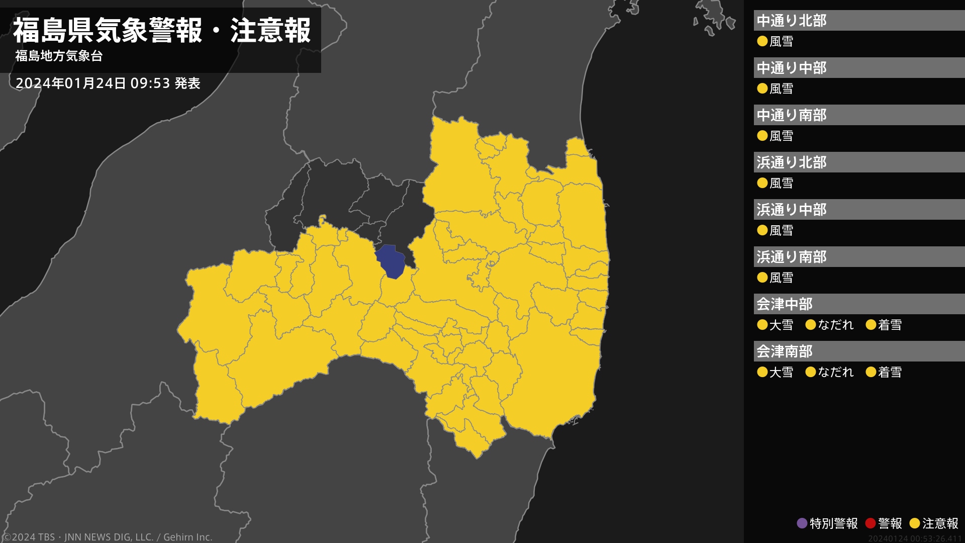 中通り、浜通りでは、風雪に注意してください。会津では、大雪やなだれ、電線等への着雪に注意してください。