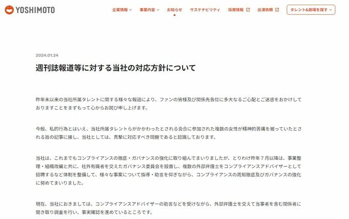 文章では「当社所属タレントらがかかわったとされる会合に参加された複数の女性が精神的苦痛を被っていたとされる旨の記事に接し、当社としては、真摯に対応すべき問題であると認識しております」と姿勢を明らかにしています。