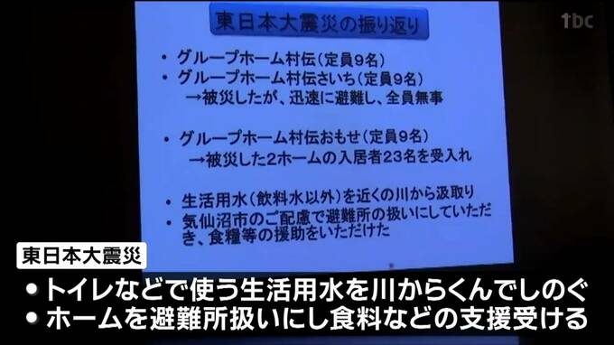 防災をテーマにしたフォーラムが23日、宮城県気仙沼市であり、グループホームの経営者が東日本大震災で生活用水や食料の確保に苦労した経験を話しました。