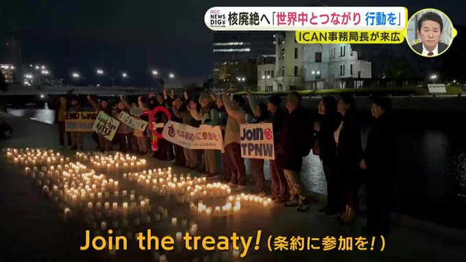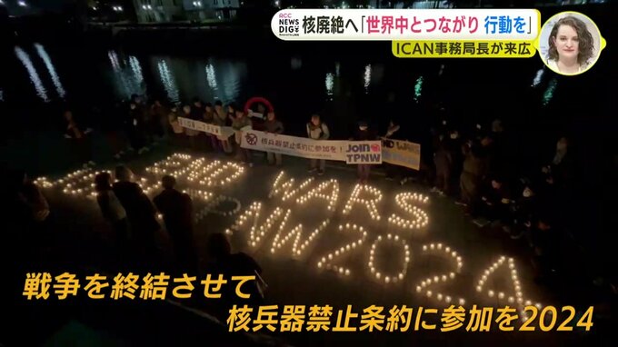 被爆者団体などが集うキャンドルイベントでは、風に消されてしまう600個のろうそくに、メリッサさんは「核兵器の数より少ないから平気よ」と、笑いながら次々と火を点けていきました。