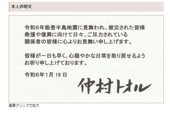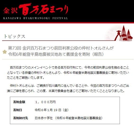 22日、金沢百万石まつりの公式サイトが、俳優の仲村トオルさんが1,000万円を、能登半島地震災害義援金に寄付したことを報告しました。