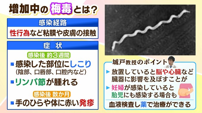 「はい。例えば発疹がある程度であれば、そんなに大きな問題にはならないと思われがちですが、重要なのはそれが発展すると脳神経の中に入っていったり、あとは心臓の大動脈に大きな病気を起こしたりする。もう一つは若い女性が感染すると母子感染を起こして子どもに重篤な状態を起こすので、それは非常に心配される事態です」