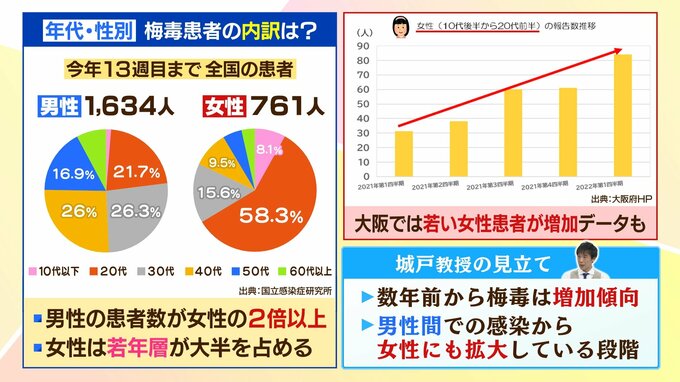 「そうです、2015年まで徐々に上がっていますよね。その間までは、その報告のほとんどが男性の報告でした。それが2015年16年から急増しているように見えますが、これが徐々に男性間の同性愛者の集団から、第1回目は性風俗の従事者、それからあまりそれとも関係ない一般の人にも拡大し、若い人に広がってきたという状況だと思います。HIVと梅毒であったら、梅毒の方が感染力が一般的には強いです。何故ならば、いわゆるオーラルセックスでも感染力が十分高くて、かなり気をつけて避妊具などを使用しないと、かなり容易にうつる感染症です」