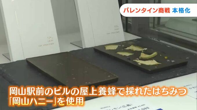 今年は天満屋の創業195周年を記念した特別な商品がお目見えしました。岡山駅前のビルの屋上で取り組む養蜂で採れたはちみつ「岡山ハニー」を使ったチョコレートです。