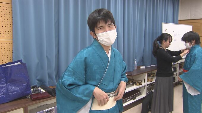 初めて触れる着物の感覚を楽しんでいるのは、県立盲学校の三線クラブの生徒たちです。