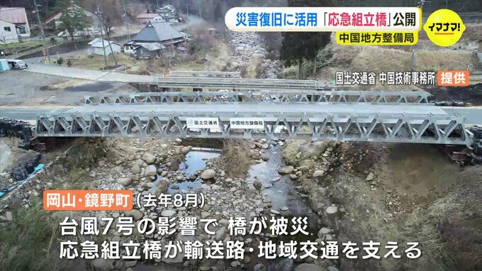 23年8月、台風7号の影響で、岡山県鏡野町の橋が被災。これに替わり、応急組立橋が活用され、救援物資などを運ぶ輸送路や、地域交通を支える道路としての役割を担いました。