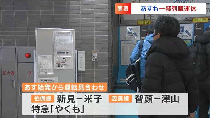 あす(25日)も伯備線の新見~米子間、因美線の智頭~津山間で始発から運転取りやめが決まっています。 また特急列車も「やくも」も始発から運休となっていて、JRでは、HPなどで最新の情報を確認するよう呼び掛けています。