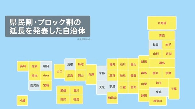 7月14日午後9時時点、ホームページ上などで延長を発表している自治体は39道県となっています。一方、延長しないという判断をした自治体もあります。