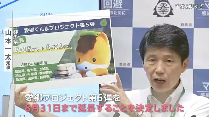 「群馬県では、現在実施している“愛郷ぐんまプロジェクト”第5弾を8月31日まで延長することを決定いたします。国が全国旅行支援を実施するまでの間、切れ目なく事業者の皆さんを支援するため」