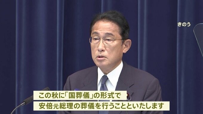 岸田総理は、亡くなった安倍元総理の葬儀について「国葬」として実施すると表明しました。9月に東京・千代田区の、日本武道館で行うことで調整しています。岸田総理「この秋に『国葬儀』の形式で、安倍元総理の葬…