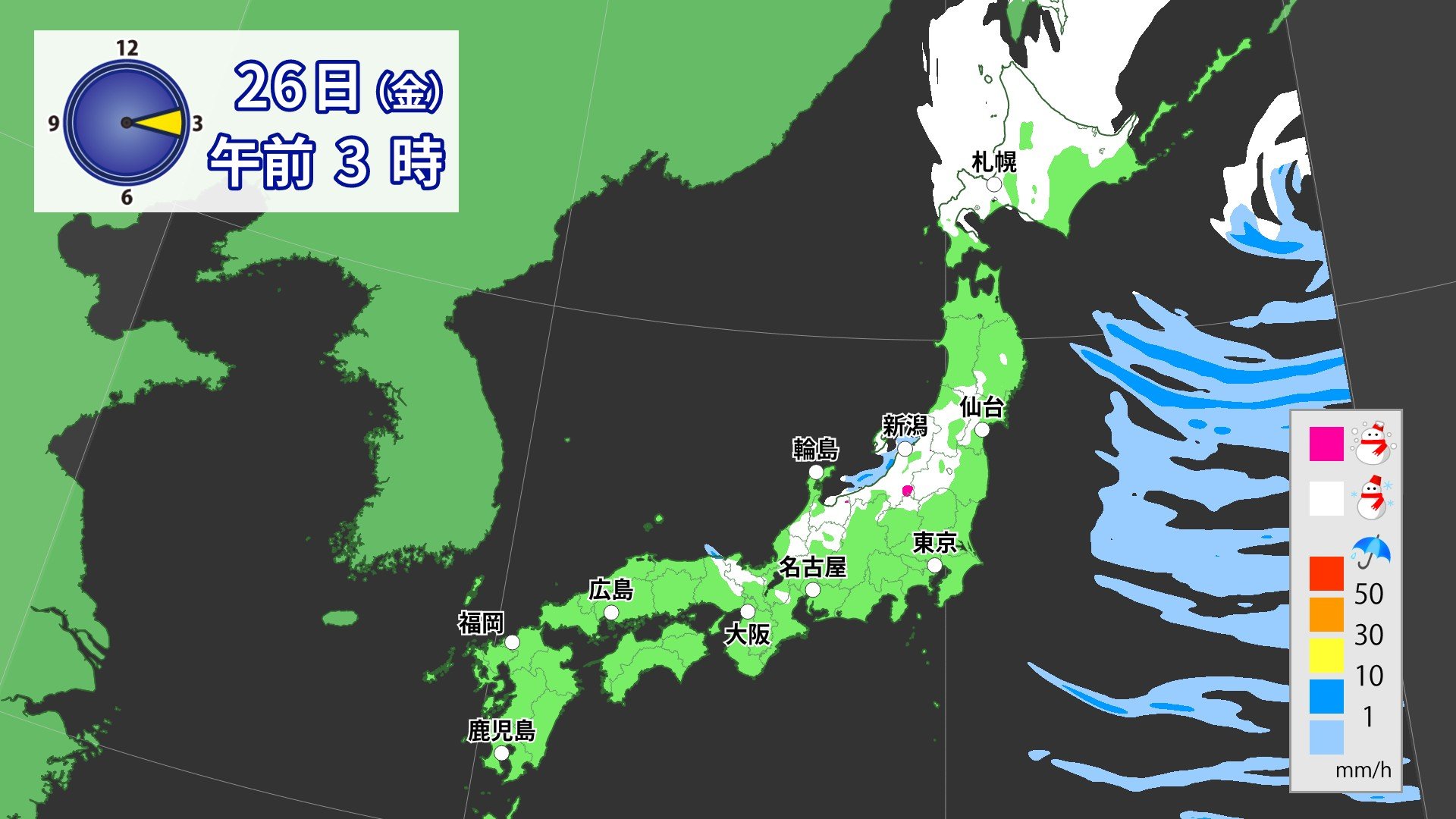 <26日18時までの24時間に予想される降雪量(多い所)>
