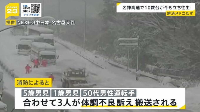 消防によると、この立ち往生で、5歳と1歳の男児、50代の男性ドライバーの合わせて3人が体調不良を訴え搬送されましたが、命に別状はありませんでした。