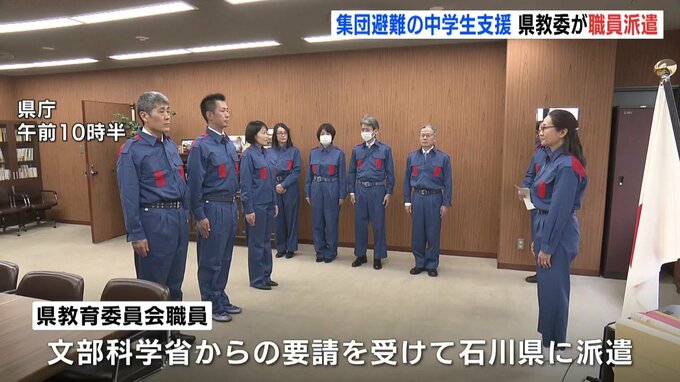 能登半島地震で集団避難している中学生をサポートするため、広島県教育委員会が職員を派遣することになり、25日、出発式が行われました。