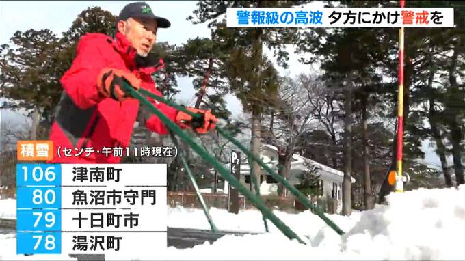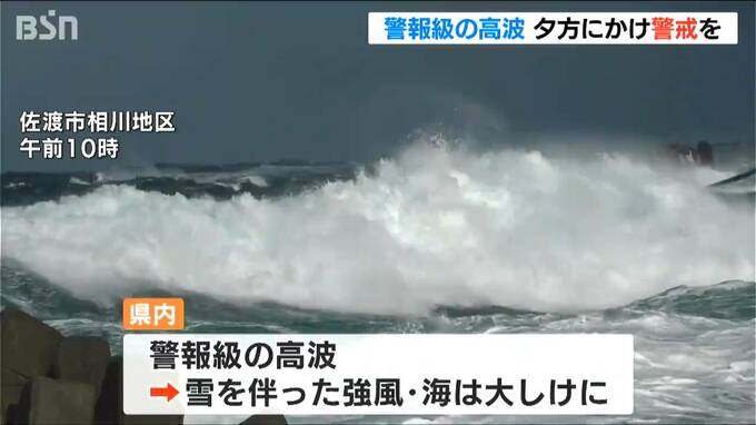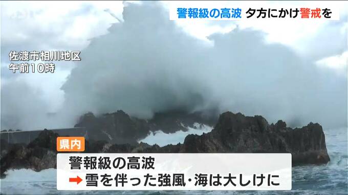 また、県内は全域で警報級の高波となっていて、海上を中心に雪を伴った強い風が吹き、海は大しけとなる見込みです。予想される波の高さは上・中・下越と佐渡で6メートルで、25日夕方にかけて高波に警戒してください。