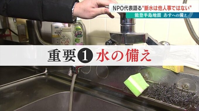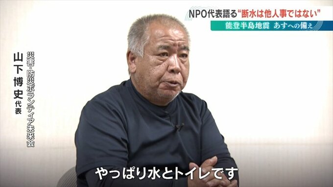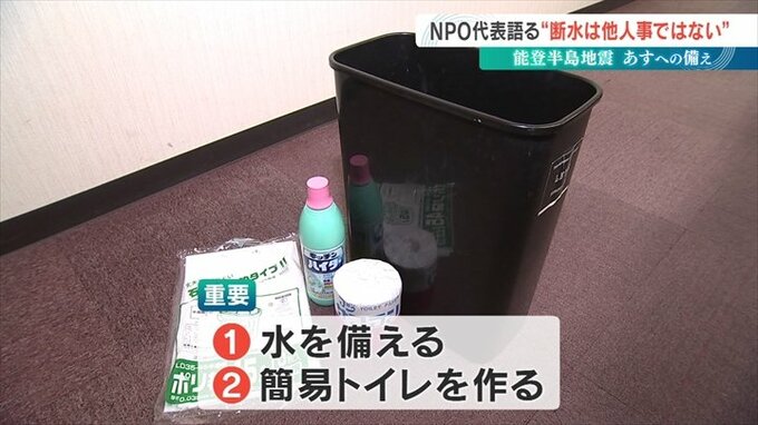 山下さんは「災害時の断水は他人事ではない」と指摘し、水を備えることと、簡易トイレのつくり方を知っておくことが大切と話します。