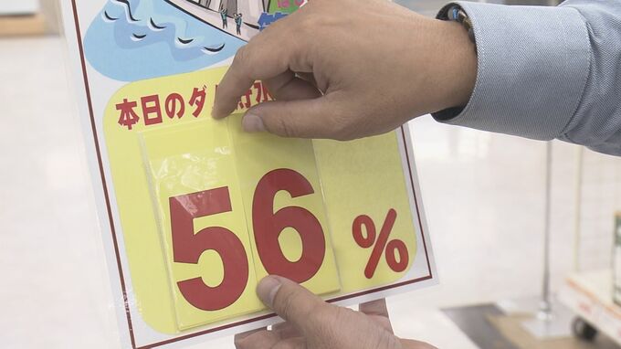 この店舗では1月24日から、徐々に低下するダムの貯水率を店内に掲示し始めました。節水に役立つグッズをまとめたコーナーも設置しています。