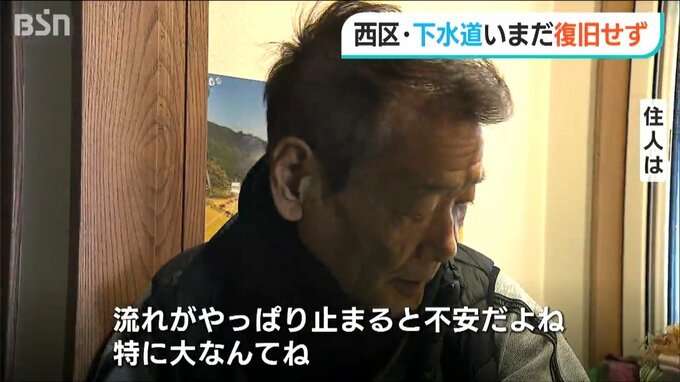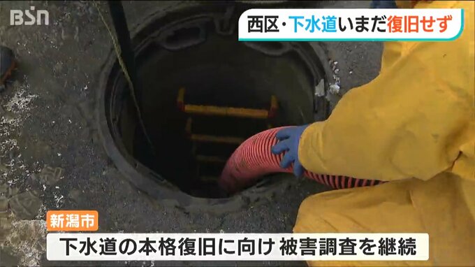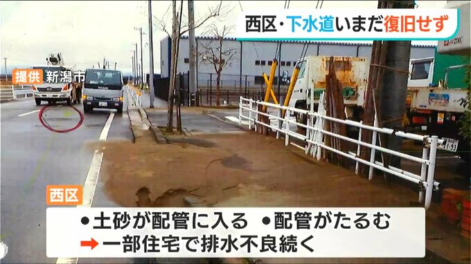 この地域では土砂が配管に流れ込んだり、配管がたるんだりする被害があり、一部の住宅で排水不良が続いています。新潟市は下水道の本格的な復旧に向けて被害調査を進めています。