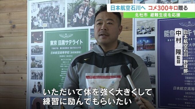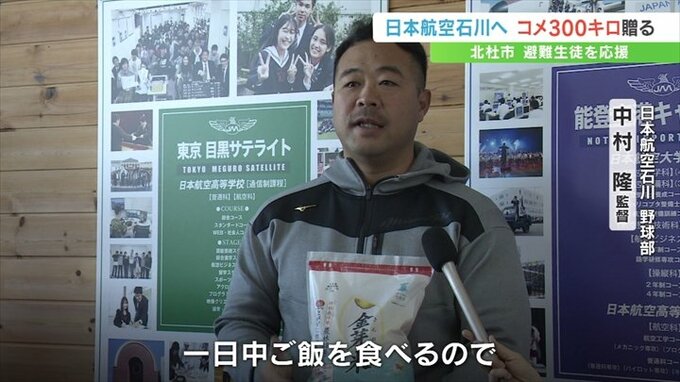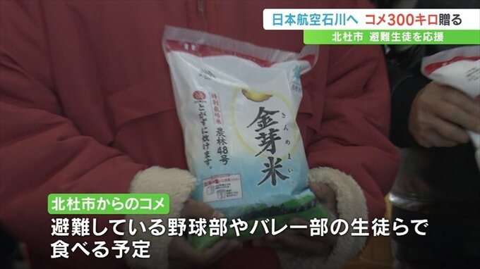 能登半島地震で被災し集団避難している日本航空高校石川の生徒を応援しようと、山梨県北杜市が市内でとれた米300㎏を贈りました。