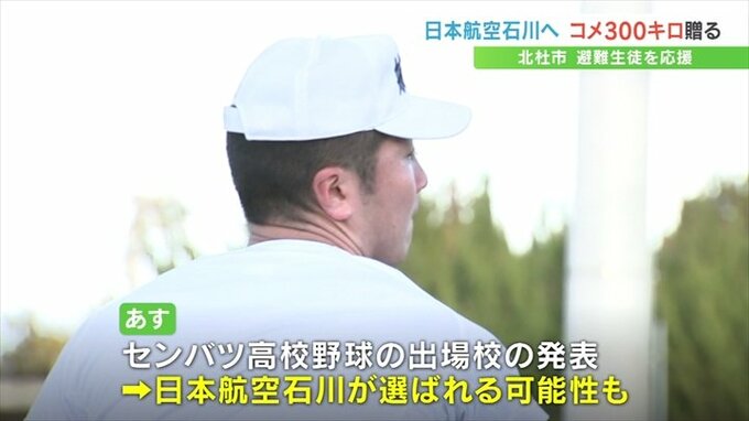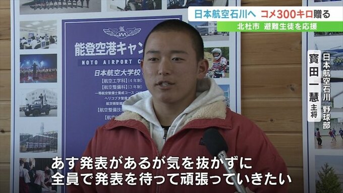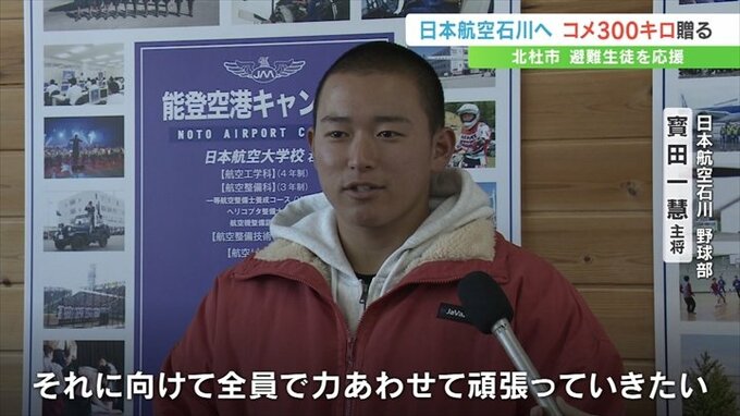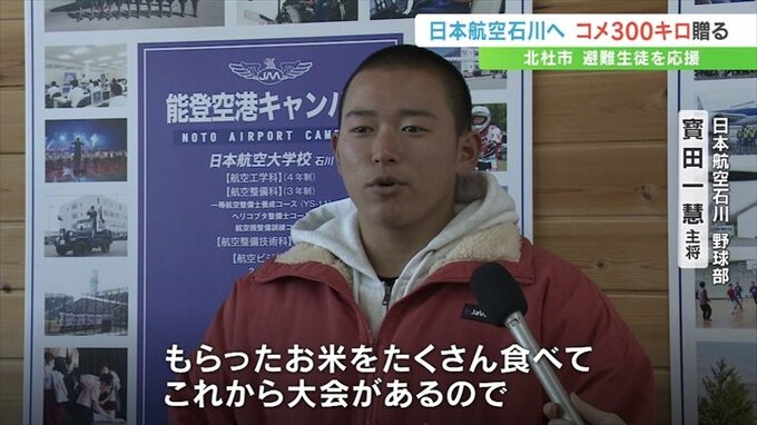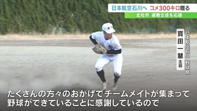 25日は北杜市の上村英司市長が甲斐市の日本航空高校 山梨キャンパスを訪れ、日本航空石川 野球部の寳田一慧キャプテンらに北杜市産の米約300㎏を贈りました。