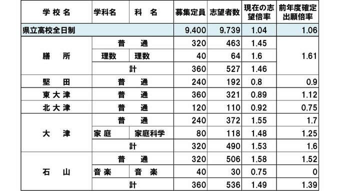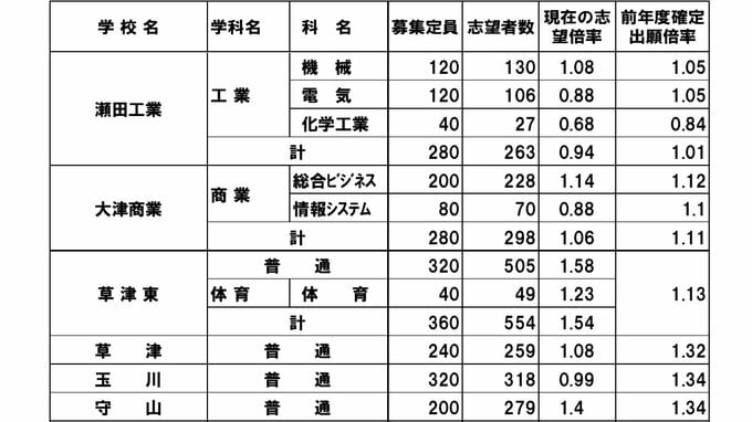 滋賀県公立高校入試2024 志願倍率 膳所1.46倍、大津1.53倍など全校掲載【令和6年度高校受験 進路志望調査】 毎日放送 2024年1月29日(月) 14:46 国内 学校別の一覧 膳所高校1.46倍 大津高校が1.53倍