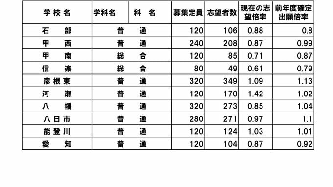 滋賀県公立高校入試2024 志願倍率 膳所1.46倍、大津1.53倍など全校掲載【令和6年度高校受験 進路志望調査】 毎日放送 2024年1月29日(月) 14:46 国内 学校別の一覧 湖南農業(農)1.43倍 河瀬1.42倍