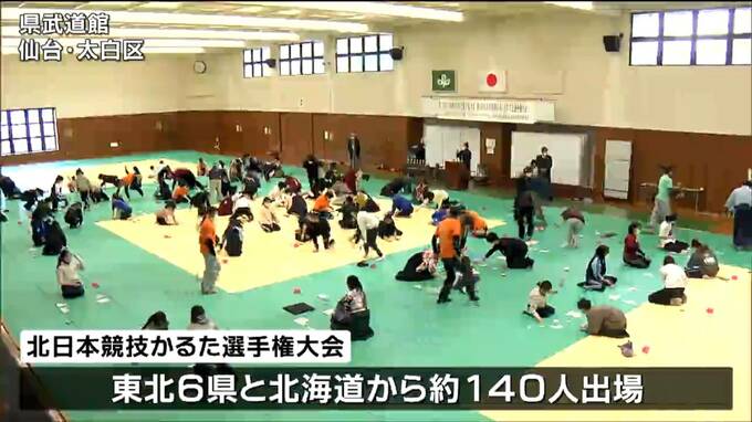県武道館で開かれた大会には、東北6県と北海道からおよそ140人が出場しました。競技かるたは、百人一首の札を使い50枚の札の位置を暗記したのち、読まれた上の句を聞いて相手よりも早く下の句の札を取り合うものです。