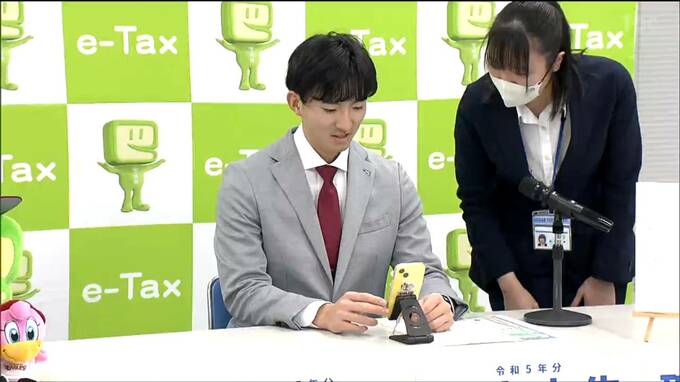 所得税などの確定申告が来月から始まるのを前に、楽天イーグルスの荘司康誠投手が27日、スマートフォンを使った確定申告を体験しました。青葉区の仙台北税務署を訪れた楽天イーグルスの荘司康誠投手。27日は「荘司…