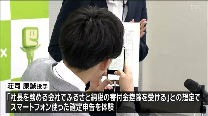 27日は「荘司投手が社長を務める会社でふるさと納税の寄付金控除を受ける」という想定のもと、源泉徴収票をカメラ機能で読み取るなど、スマートフォンを使った確定申告を体験しました。