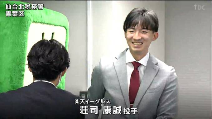 青葉区の仙台北税務署を訪れた楽天イーグルスの荘司康誠投手。