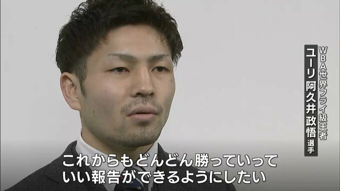 (WBA世界フライ級王者 ユーリ阿久井政悟選手)「チャンピオン獲得を報告できたことはうれしいですし、これからもどんどん勝っていって、いい報告ができるようにしたいなと思いました」