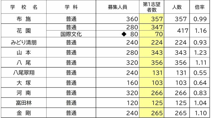 大阪府公立高校入試2024 志願倍率は北野1.5倍、茨木2.0倍、天王寺1.21倍に【令和6年度高校受験 進路希望調査】 毎日放送 2024年1月29日(月) 19:37 国内 学校別の一覧 東1.63倍 清水谷1.23倍 八尾1.11倍